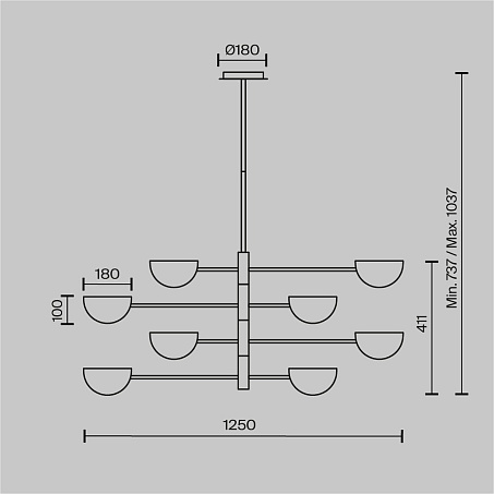 Herraje y plafones de metal, color negro. Forma original del plafón de contorno suave. Las fuentes de luz están ocultas bajo el dispersor acrílico.