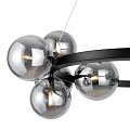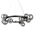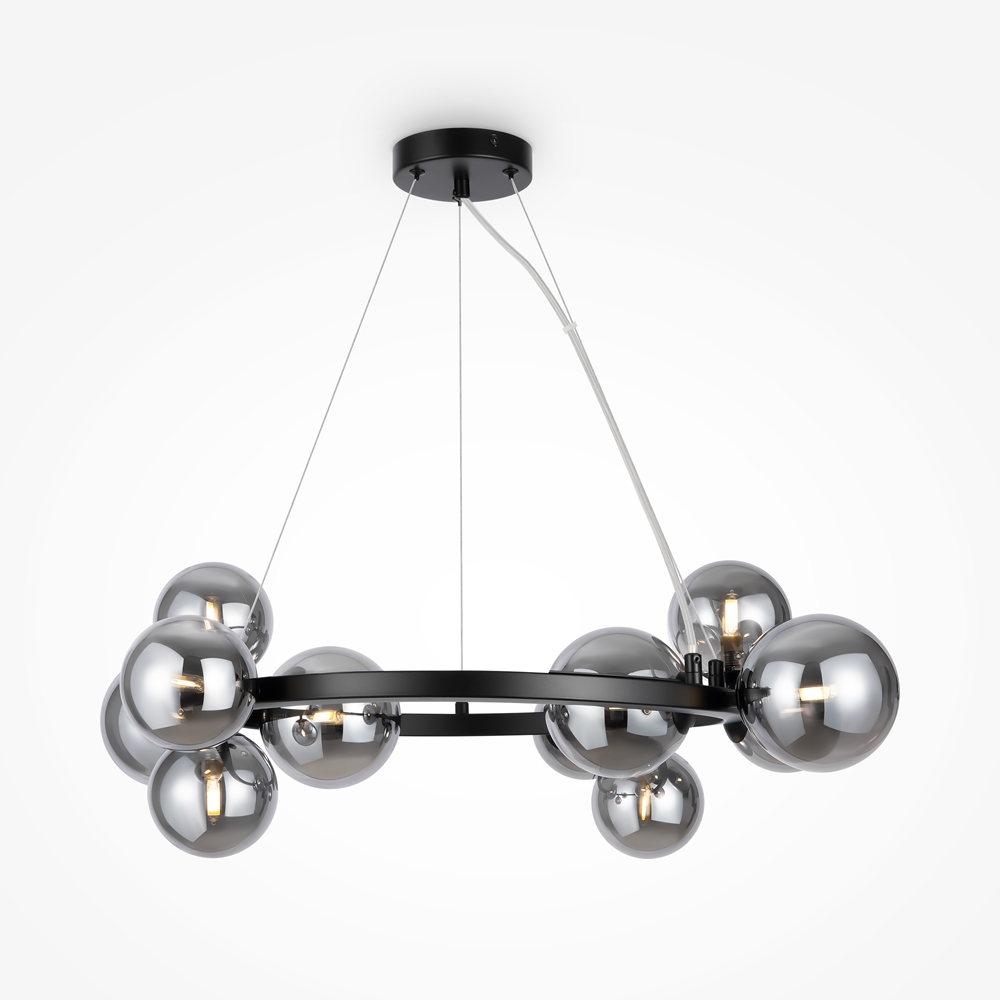 Herraje de metal de 4 colores: negro mate, negro, cromo, oro. Plafones: vidrio soplado. Colores: ahumado, ambarino, coñac, blanco mate y negro. Diseño con imitación de estructura molecular. La altura de las lámparas colgantes se regula con el cable. Bombilla con el casquillo G9.