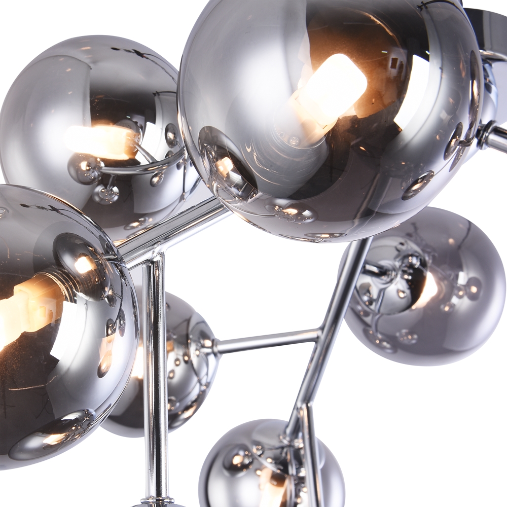 Herraje de metal de 4 colores: negro mate, negro, cromo, oro. Plafones: vidrio soplado. Colores: ahumado, ambarino, coñac, blanco mate y negro. Diseño con imitación de estructura molecular. La altura de las lámparas colgantes se regula con el cable. Bombilla con el casquillo G9.