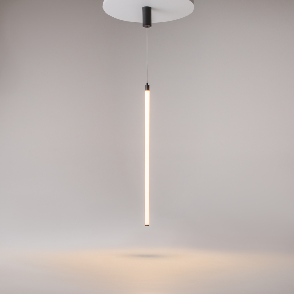 Le luminaire à peine perceptible de la série Ray imprègne littéralement l'espace de lumière. De puissantes LED SMD sont cachées sous un corps en métal et acrylique. L'armature est en aluminium. Les luminaires sont peintes en noir, blanc et doré mat. Le fil fin ajoute de la légèreté au design et est réglable en longueur, vous permettant de positionner le luminaire à la hauteur souhaitée. Différentes longueurs de corps vous permettront de créer une composition individuelle pour la décoration intérieure.