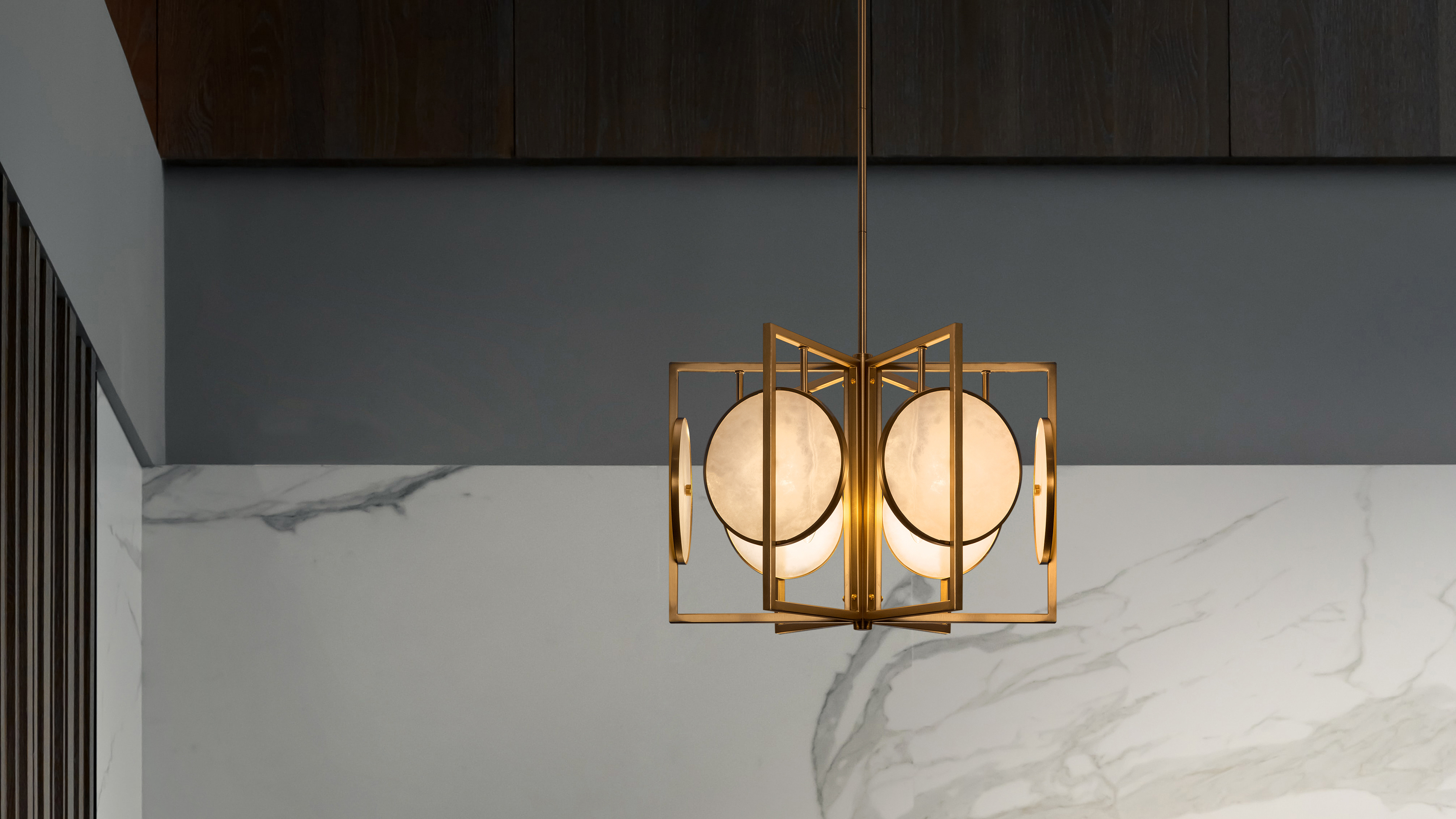 Armatura in metallo galvanizzata in colore oro. Decoro: lastre di pietra naturale con disegno strutturato. Combinazione di linee rettangolari ed elementi arrotondati nel design. La sorgente luminosa è una lampadina con attacco E14.