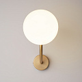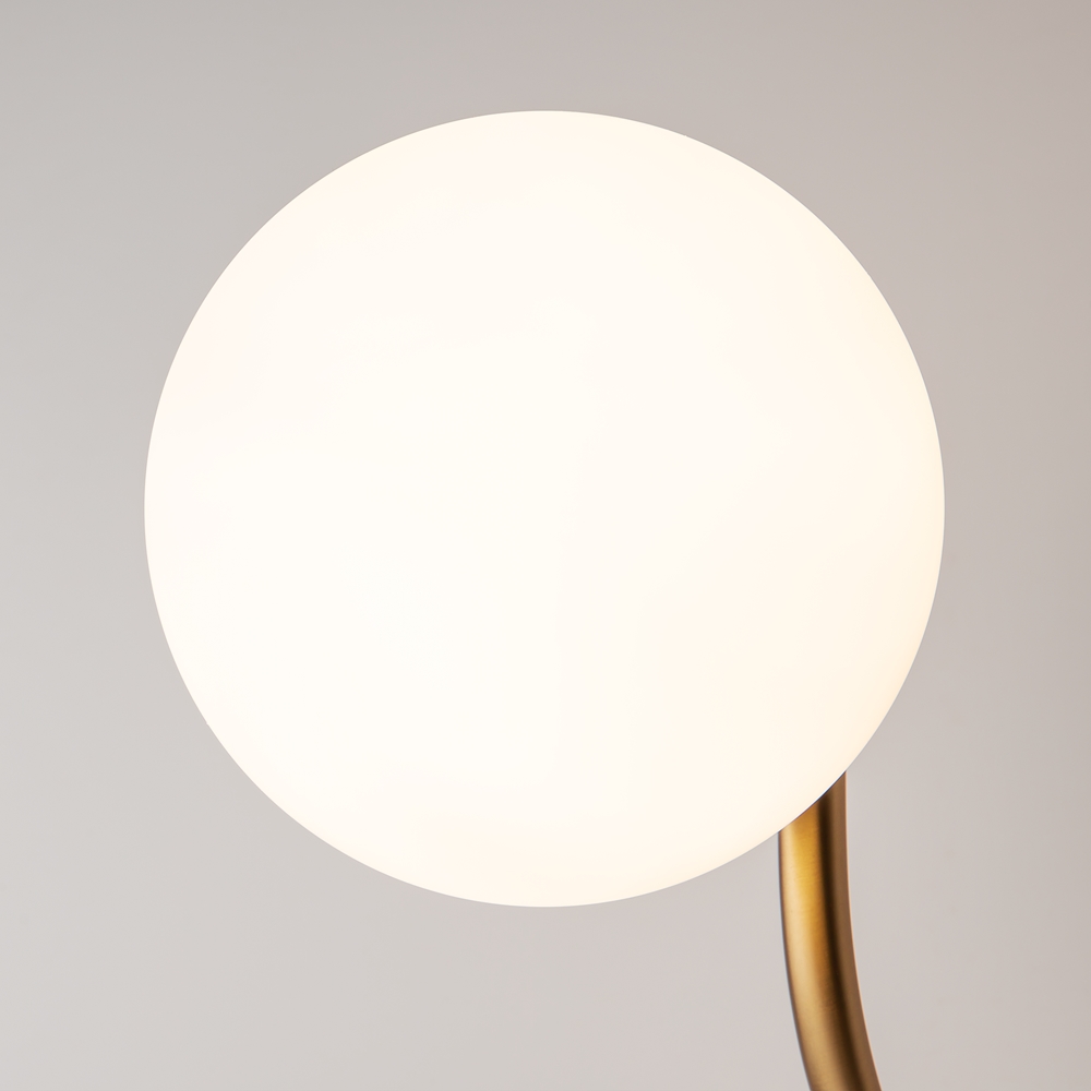 Armatura in metallo verniciato in color ottone. Plafoniere-sfere di vetro bianco opaco. Forme aerodinamiche alla moda. Design in stile retrò. Sorgente luminosa - lampadine con attacco E14.