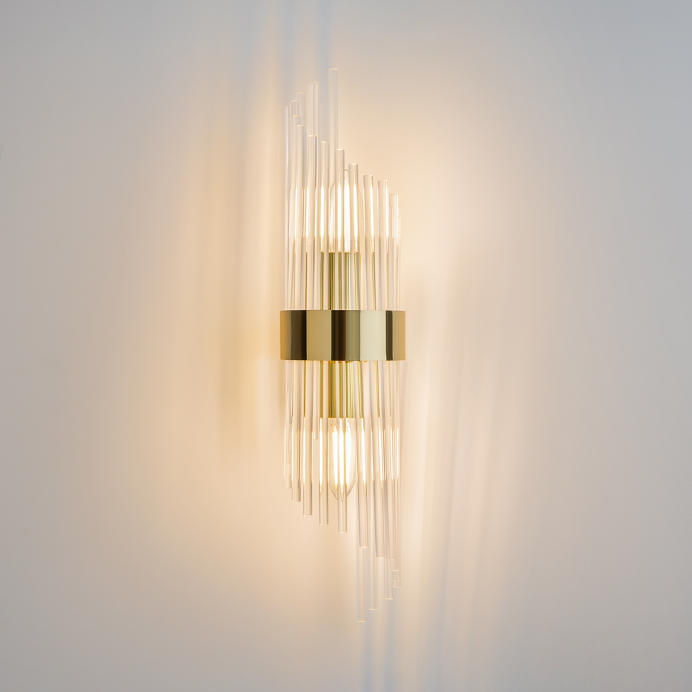 Il materiale dell'armatura è metallo, il colore è oro. L’ elemento decorativo e’ realizzato in vetro trasparente sotto forma di tubi in rilievo. Il portalampada e’ E14. Le lampadine non sono disponibili su questo modello.