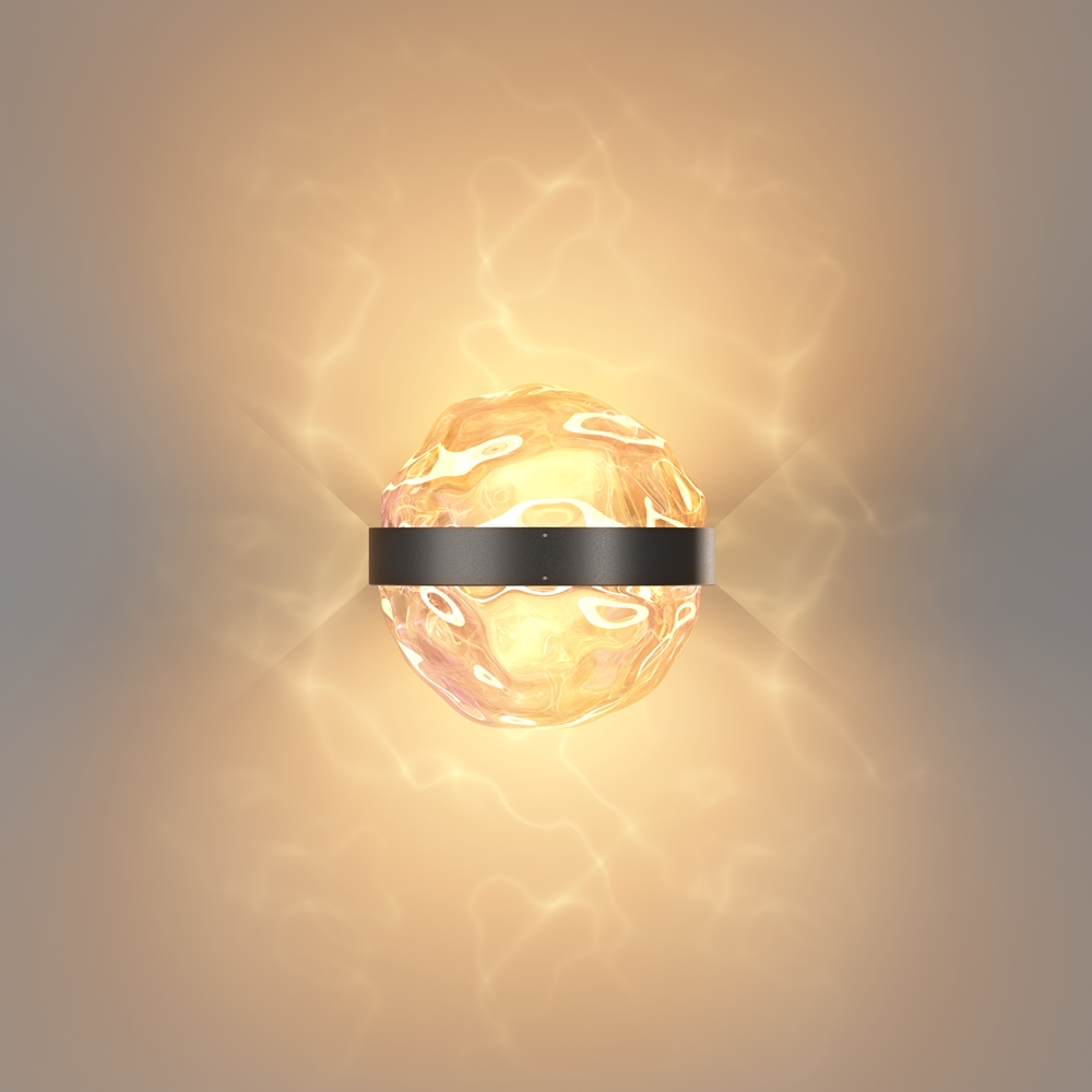 Le linee ondulate dei paralumi come getti d'acqua congelati nel vetro, creano un gioco ipnotico di riflessi luminosi. Una soluzione nuova con un elemento a LED, che circola diretto verso l'interno, fornisce un'illuminazione morbida e ariosa.
