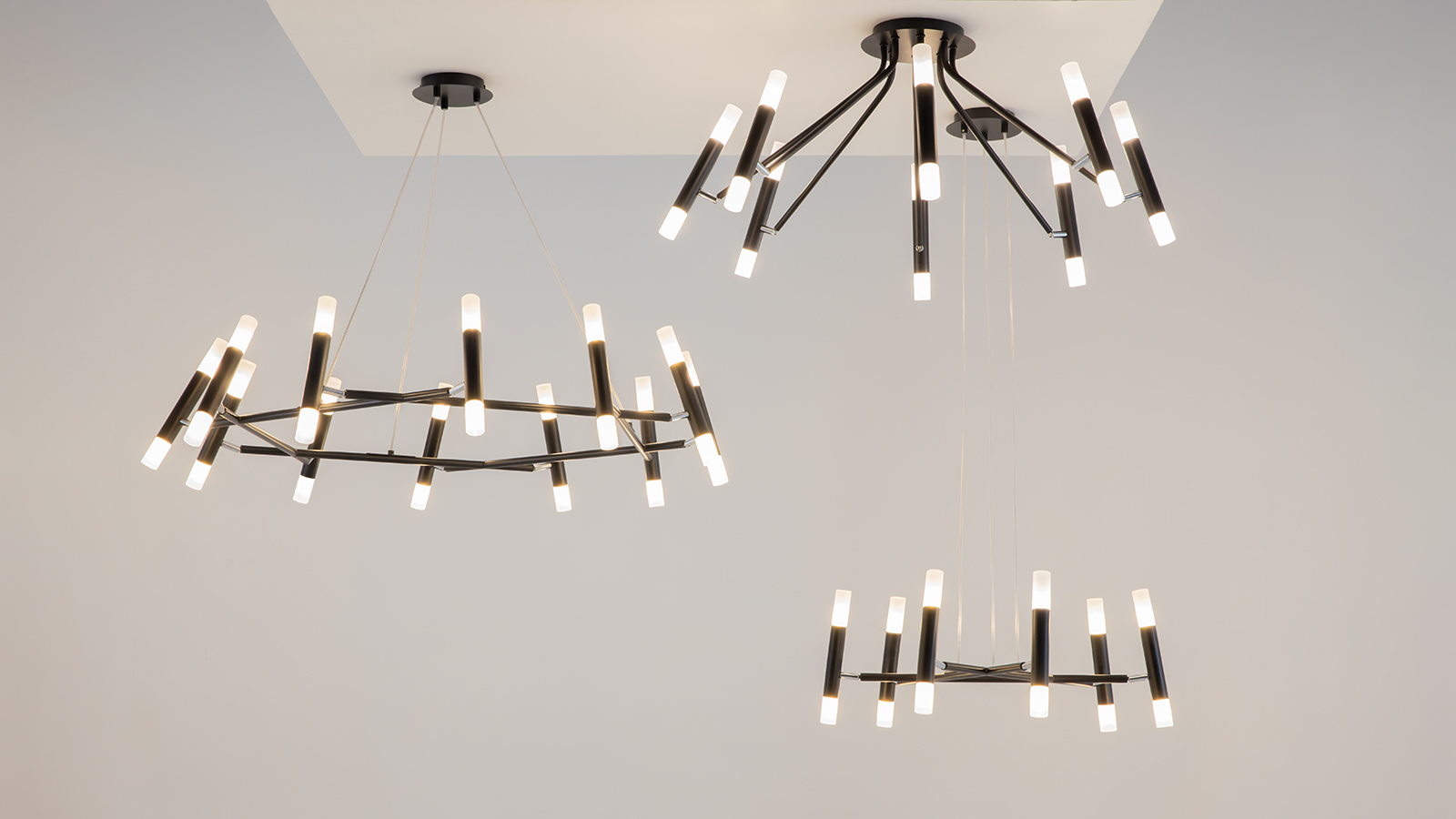 La struttura in metallo, colore nero opaco. I diffusori cilindrici in vetro opaco. La personalizzazione dei diffusori: sono girevoli a 340° in piano orizzontale ed a 90° in piano verticale.