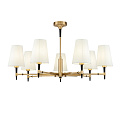Armatura metallica galvanizzata in colore ottone. Alcuni degli elementi sono tinti di nero. Paralumi in tessuto bianco applicati su PVC. Sorgente luminosa - lampadine con attacco E14.