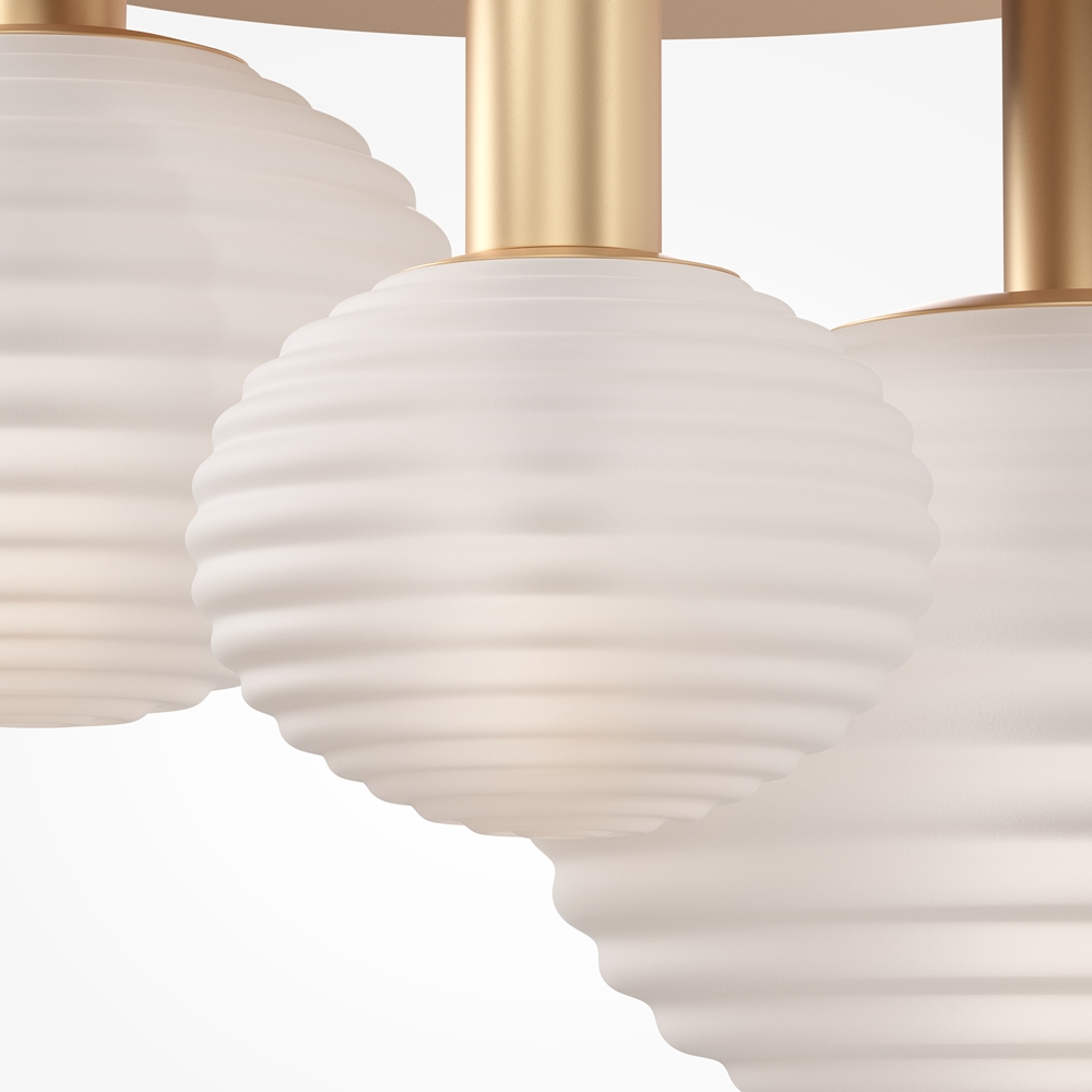 Il materiale dell'armatura è metallo, i colori sono nero, oro. I paralumi rotondi "dinamichi" con rilievo a spirale. Il materiale dei paralumi è vetro, i colori sono bianchi opachi, fumosi lucidi. La sorgente dell’illuminazione sono le lampadine con portalampade E14, E27.