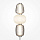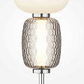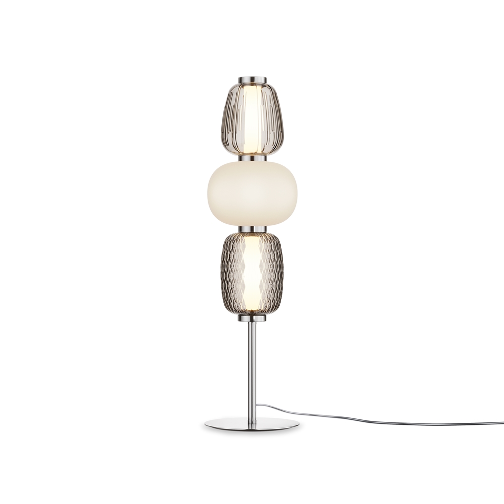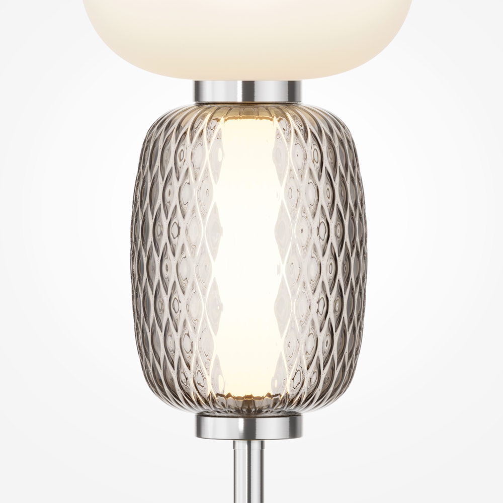 L’armatura è in metallo, i colori sono oro, cromo. Un mix di paralumi di forme arrotondate e allungate in vetro bianco opaco e trasparente con motivo reticolare e lineare ripetuto in rilievo. Sorgente luminosa a LED, la temperatura di colore e’ 3000K.