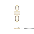L’armatura è in metallo, i colori sono oro, cromo. Un mix di paralumi di forme arrotondate e allungate in vetro bianco opaco e trasparente con motivo reticolare e lineare ripetuto in rilievo. Sorgente luminosa a LED, la temperatura di colore e’ 3000K.