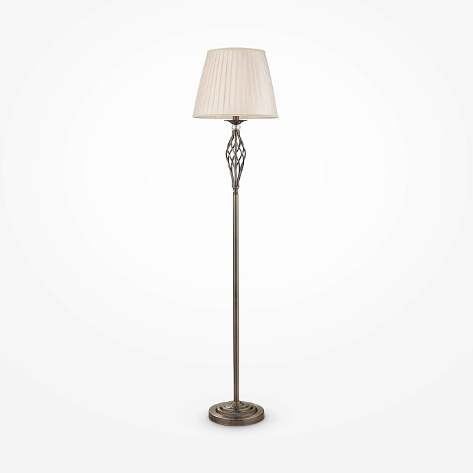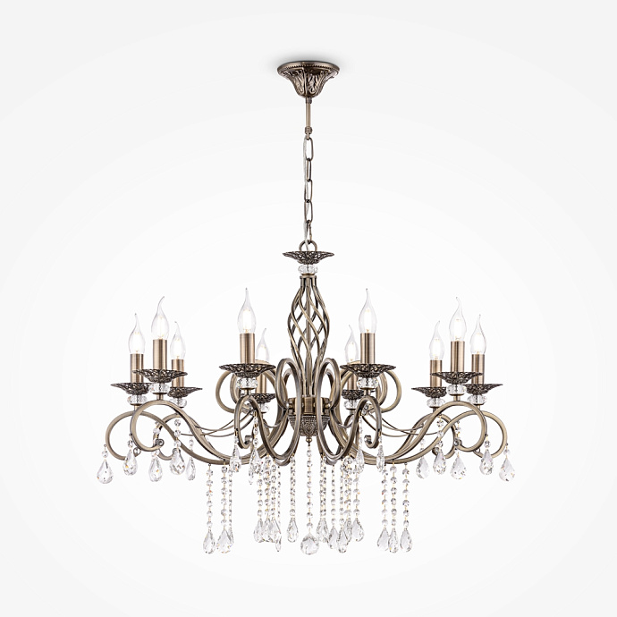 Struttura in metallo, finitura in bianco e oro. Paralumi in organza bianca plissettati. Pendenti in cristallo.