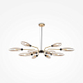 Armatura in metallo color oro opaco. I singoli elementi sono tinti di nero. Plafoniere di vetro color ambra. Originale forma allungata delle plafoniere. Altezza di sospensione regolabile.