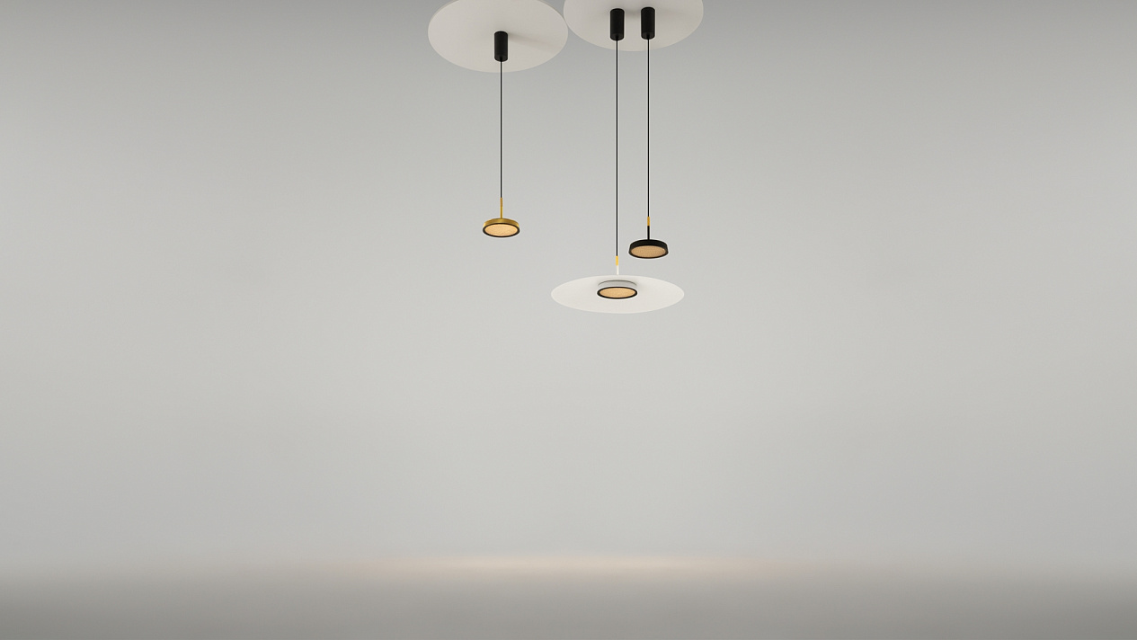 Il corpo fato in metallo, la tavolozza dei colori e’ nero, bianco, ottone, oro e terracotta. Due tipi di paralumi: una “tavoletta” con un rilievo grafico di linee asimmetriche; una “tavoletta” + un “piatto”di metallo perfettamente liscio. Il design è ispirato all'estetica suprematista di El Lissitzkij. La sorgente luminosa a LED, la temperatura di colore e’ 3000K. Il cavo regolabile di 3 metri.