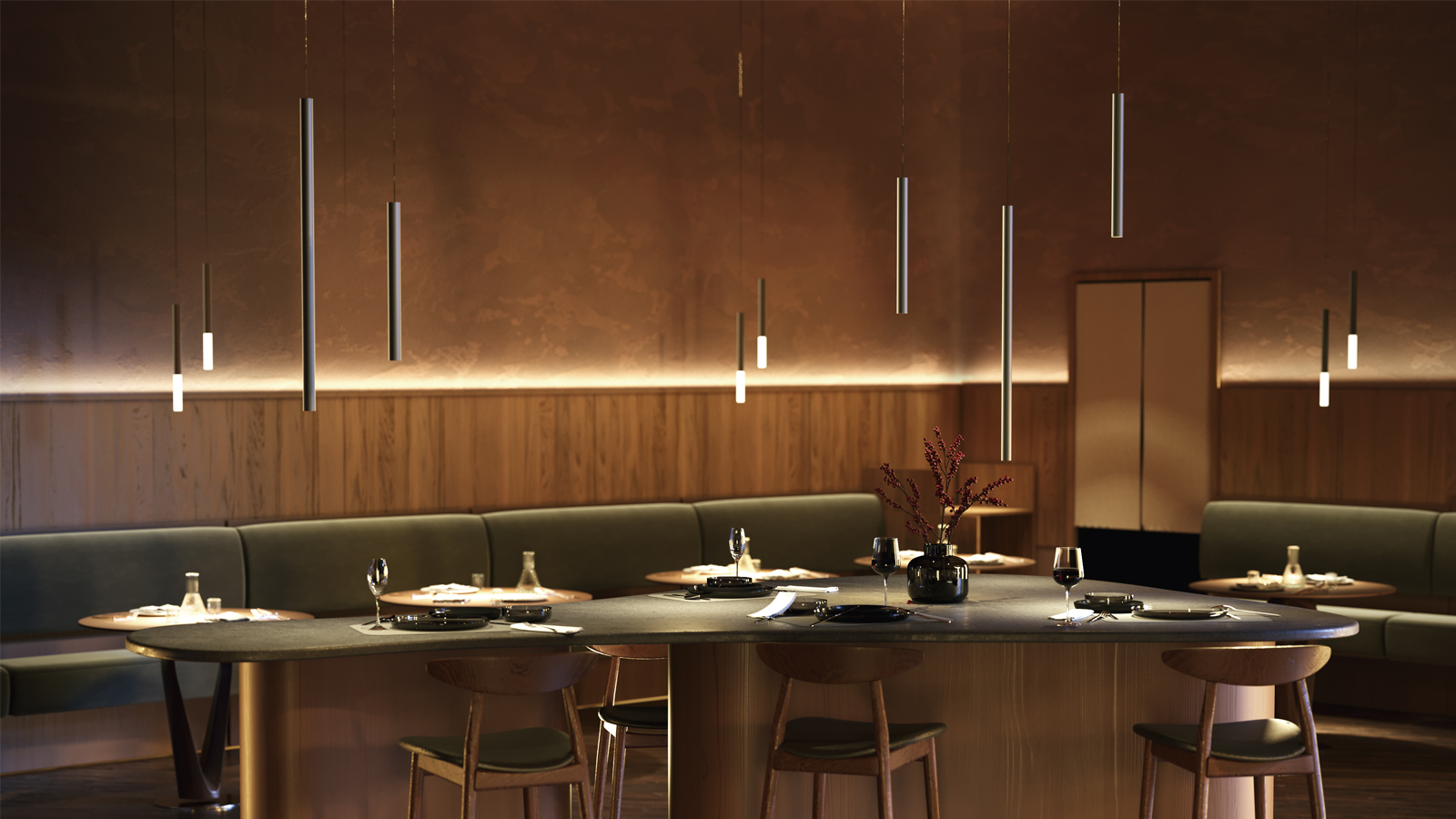 Il materiale dell'armatura è il metallo, i colori sono nero, bianco, oro. Le forme sono minimaliste, sottili e laconici. Esse sono commode per la creazione delle composizioni. I modelli con diffusore acrilico dotati dell’illuminazione a LED, la temperatura del colore-4000 K.