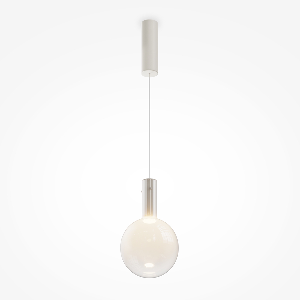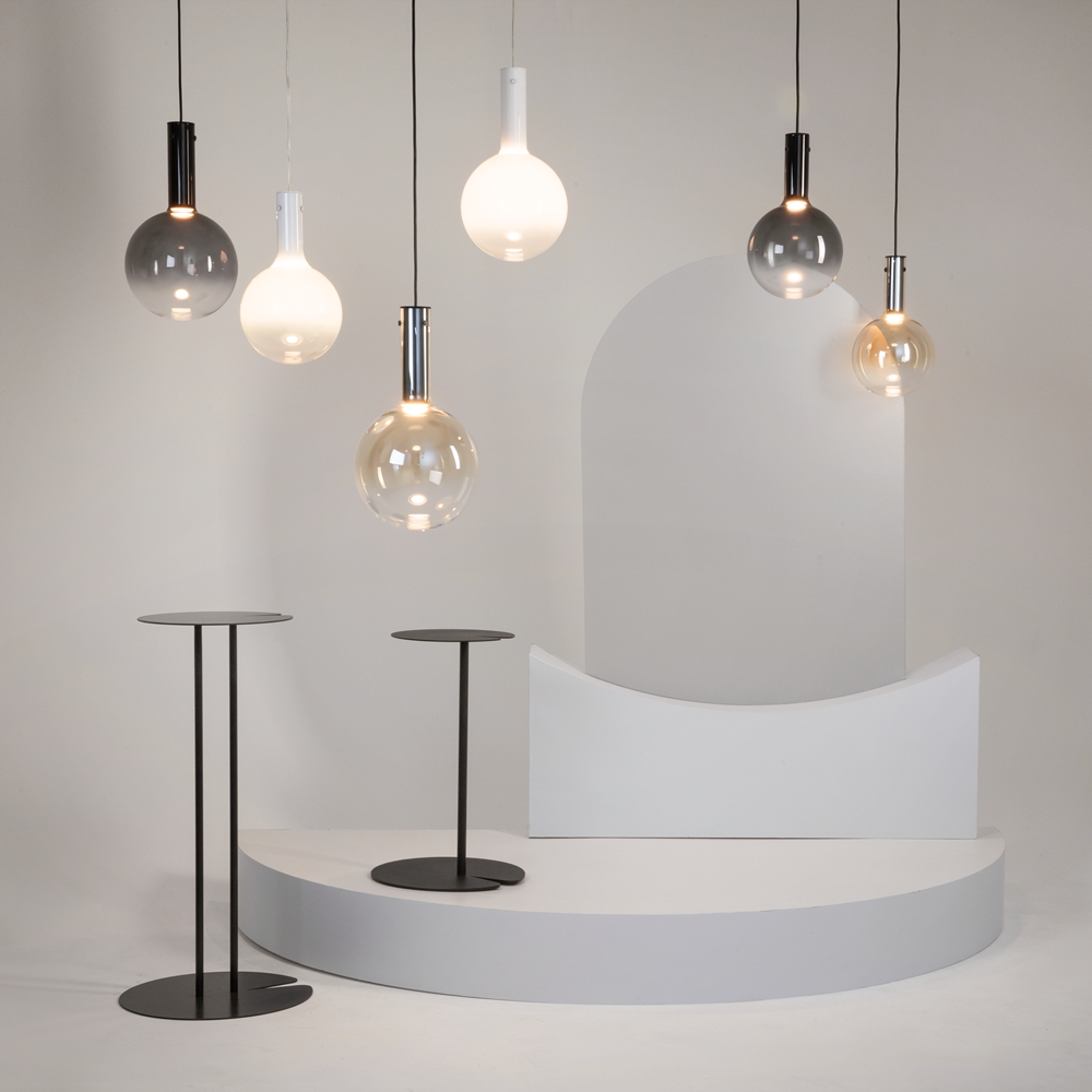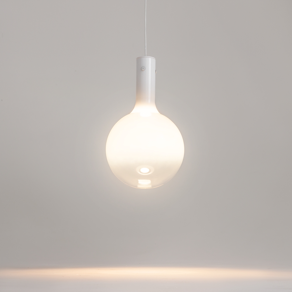 L'effetto fluttuante nell'aria si ottiene grazie ai paralumi a forma di palla in vetro soffiato che si fondono senza soluzione di continuità nel rinforzo – fissaggio con filo, e la colorazione sfumata completa questa illusione.