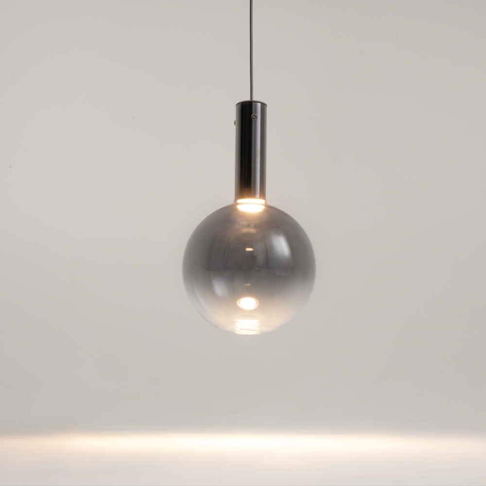 L'effetto fluttuante nell'aria si ottiene grazie ai paralumi a forma di palla in vetro soffiato che si fondono senza soluzione di continuità nel rinforzo – fissaggio con filo, e la colorazione sfumata completa questa illusione.