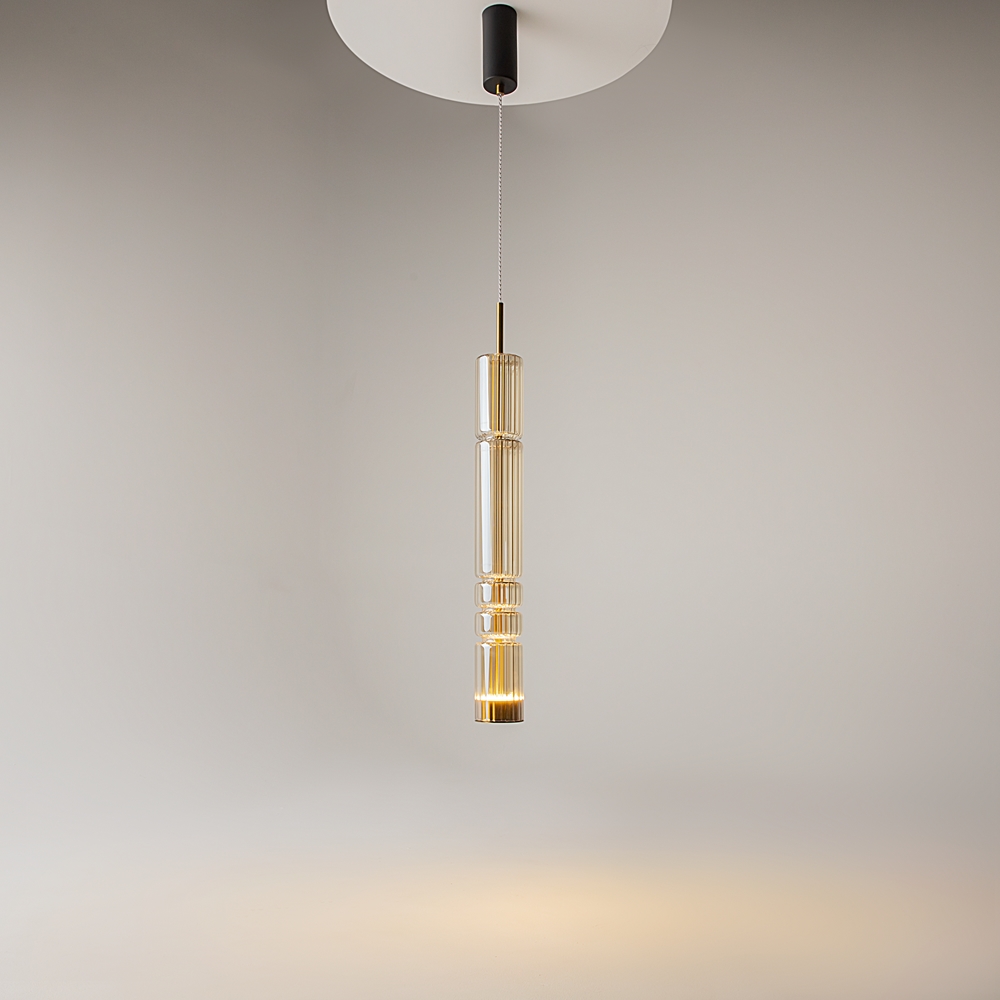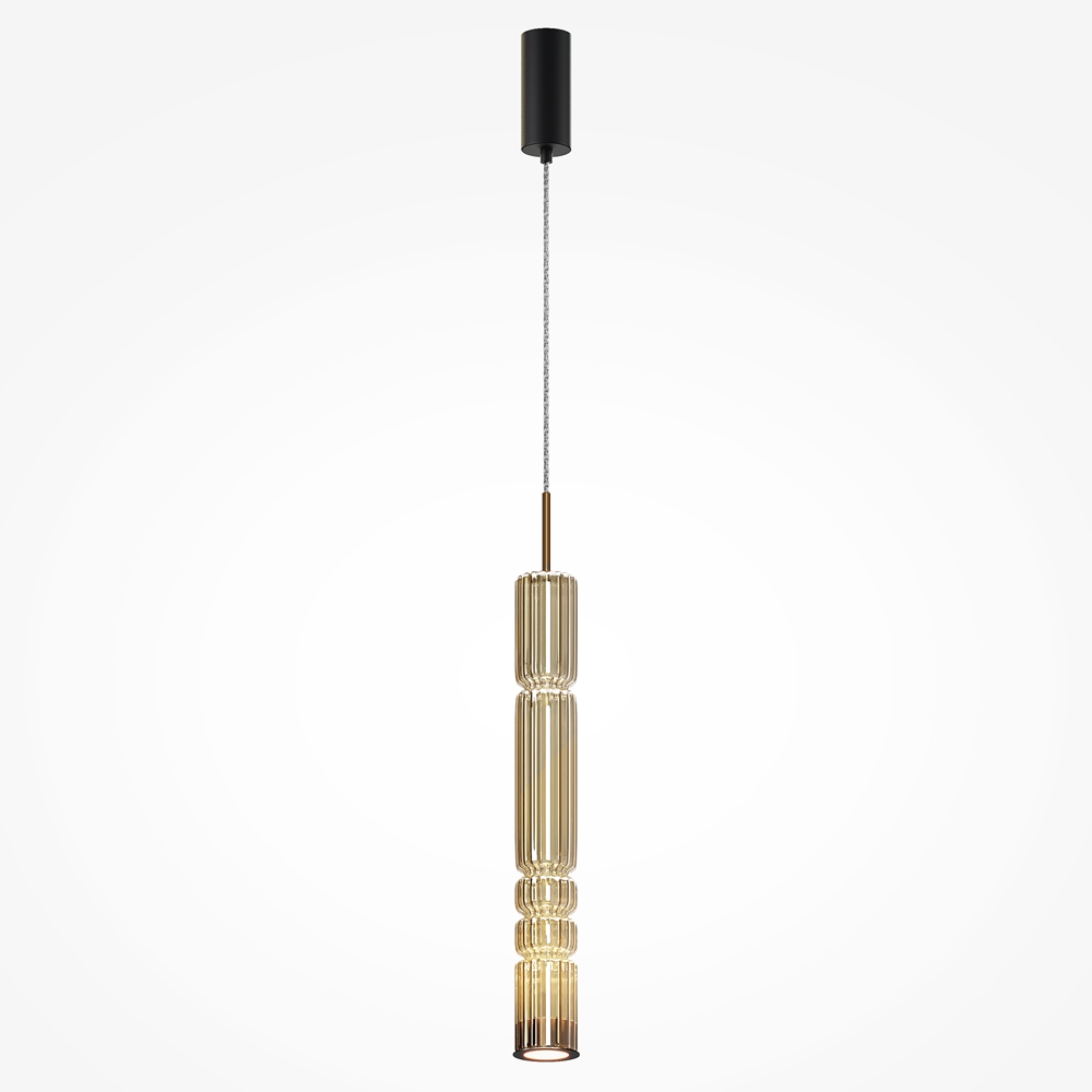 L'armatura è in metallo, i colori sono cromo, ottone, nero. Paralumi cilindrichi in vetro con motivo verticale in rilievo in tre tonalità: trasparente, cognac, fumoso. Metafora delle antiche colonne del tempio greco sotto forma di lampade. Sorgente luminosa a LED. La temperatura di colore e’ 3000K.