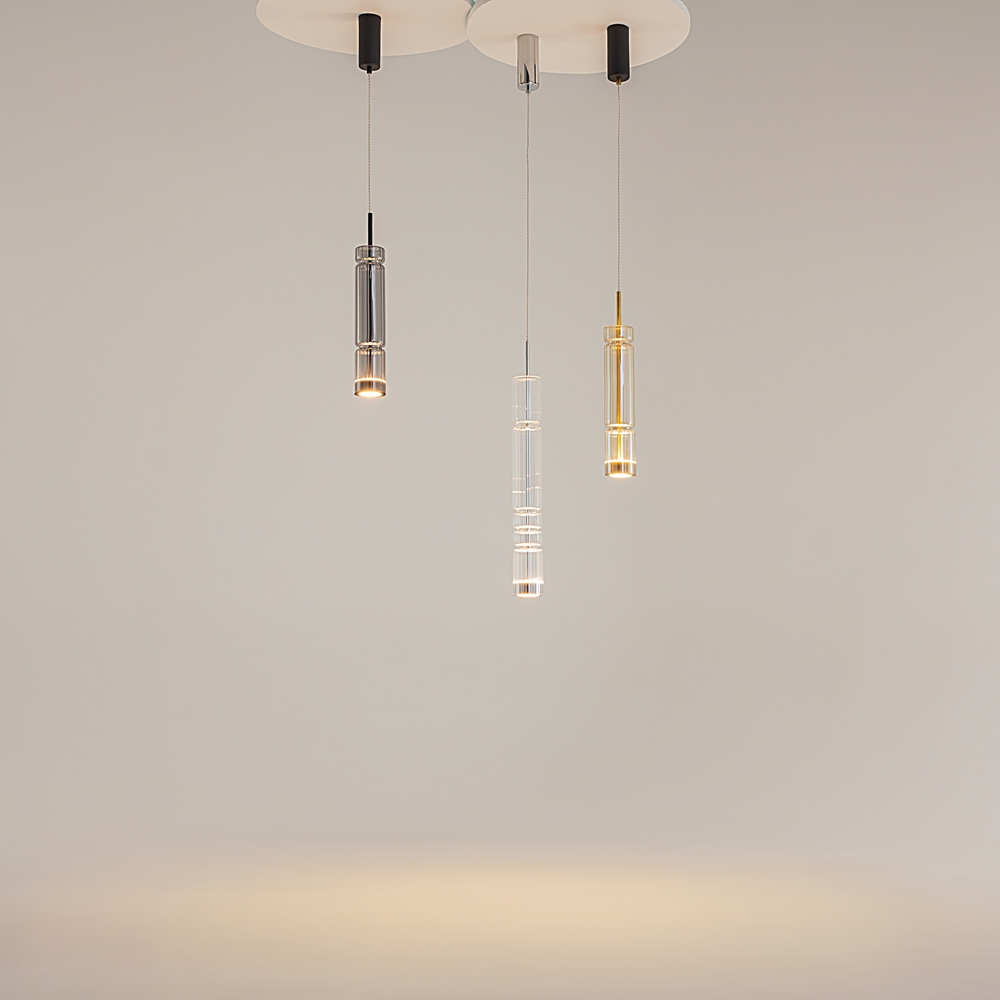 L'armatura è in metallo, i colori sono cromo, ottone, nero. Paralumi cilindrichi in vetro con motivo verticale in rilievo in tre tonalità: trasparente, cognac, fumoso. Metafora delle antiche colonne del tempio greco sotto forma di lampade. Sorgente luminosa a LED. La temperatura di colore e’ 3000K.
