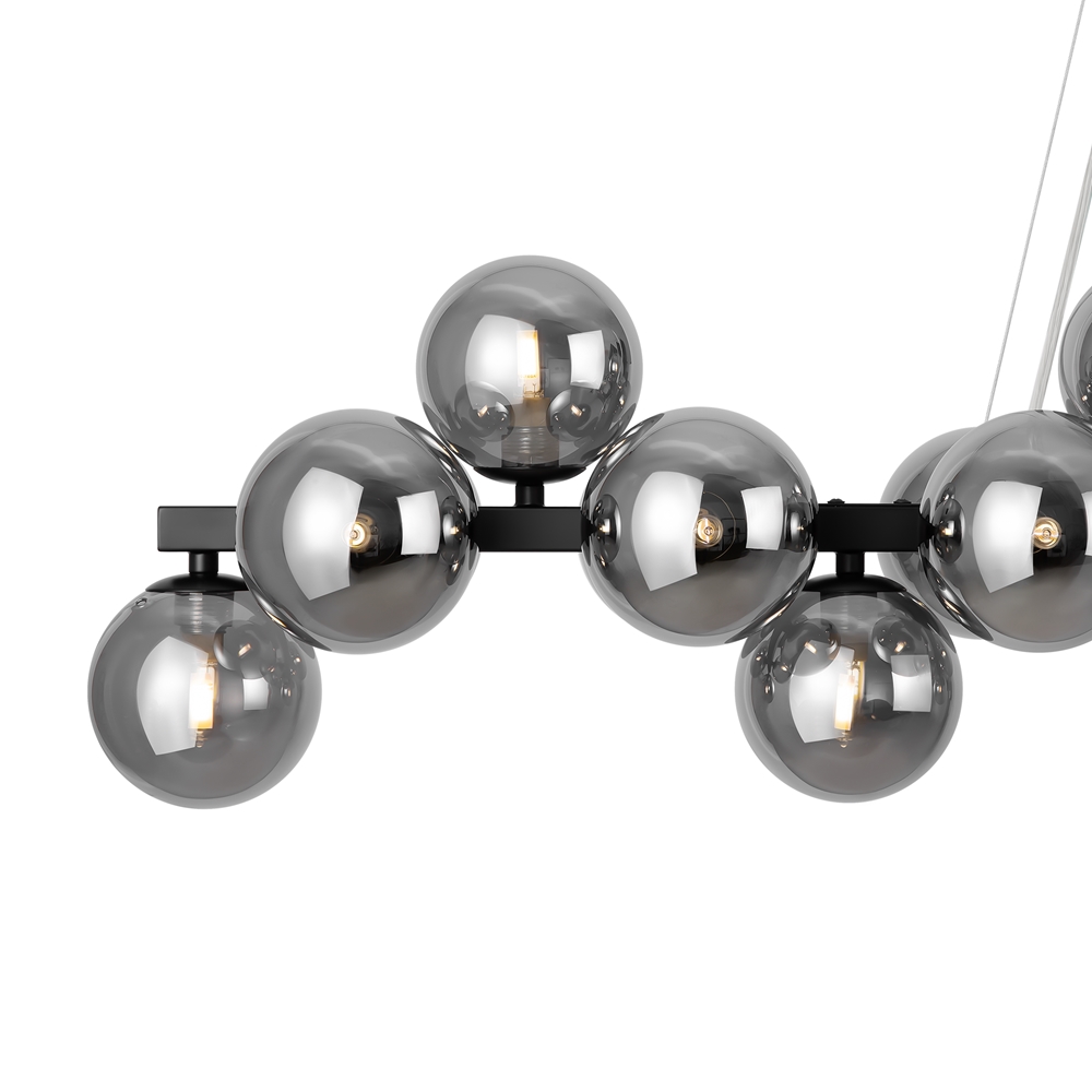 Ferramenta in metallo in 4 colori: nero opaco, nero, cromo, oro. Plafoniere - vetro soffiato. Colori: affumicato, ambra, cognac, bianco opaco e nero. Design con imitazione della struttura molecolare. L'altezza delle lampade a sospensione è regolabile con un cavo. Lampadina con attacco G9.
