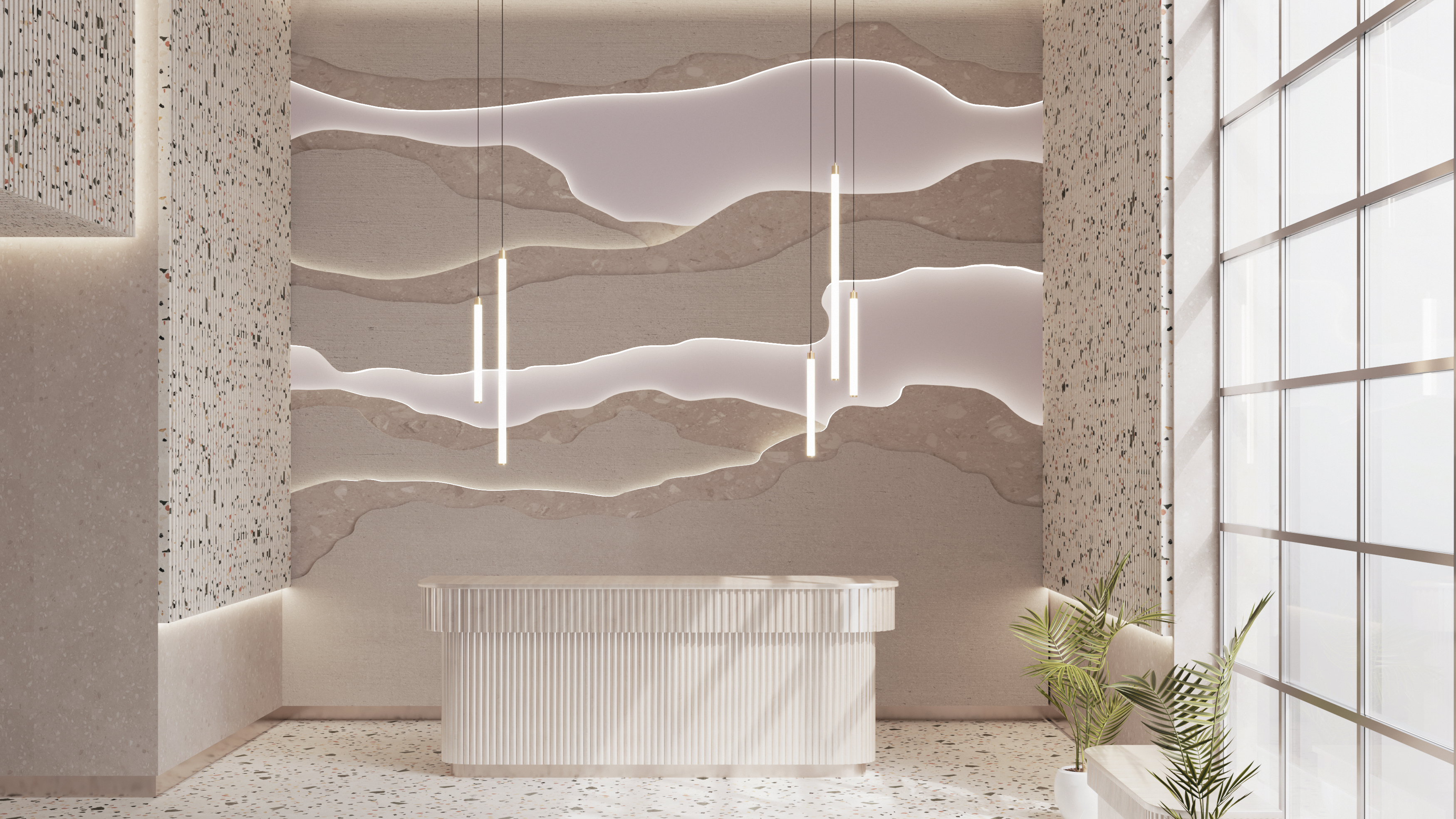 Sospensioni di diverse dimensioni, lampada da terra e lampada da tavolo in un unico design.