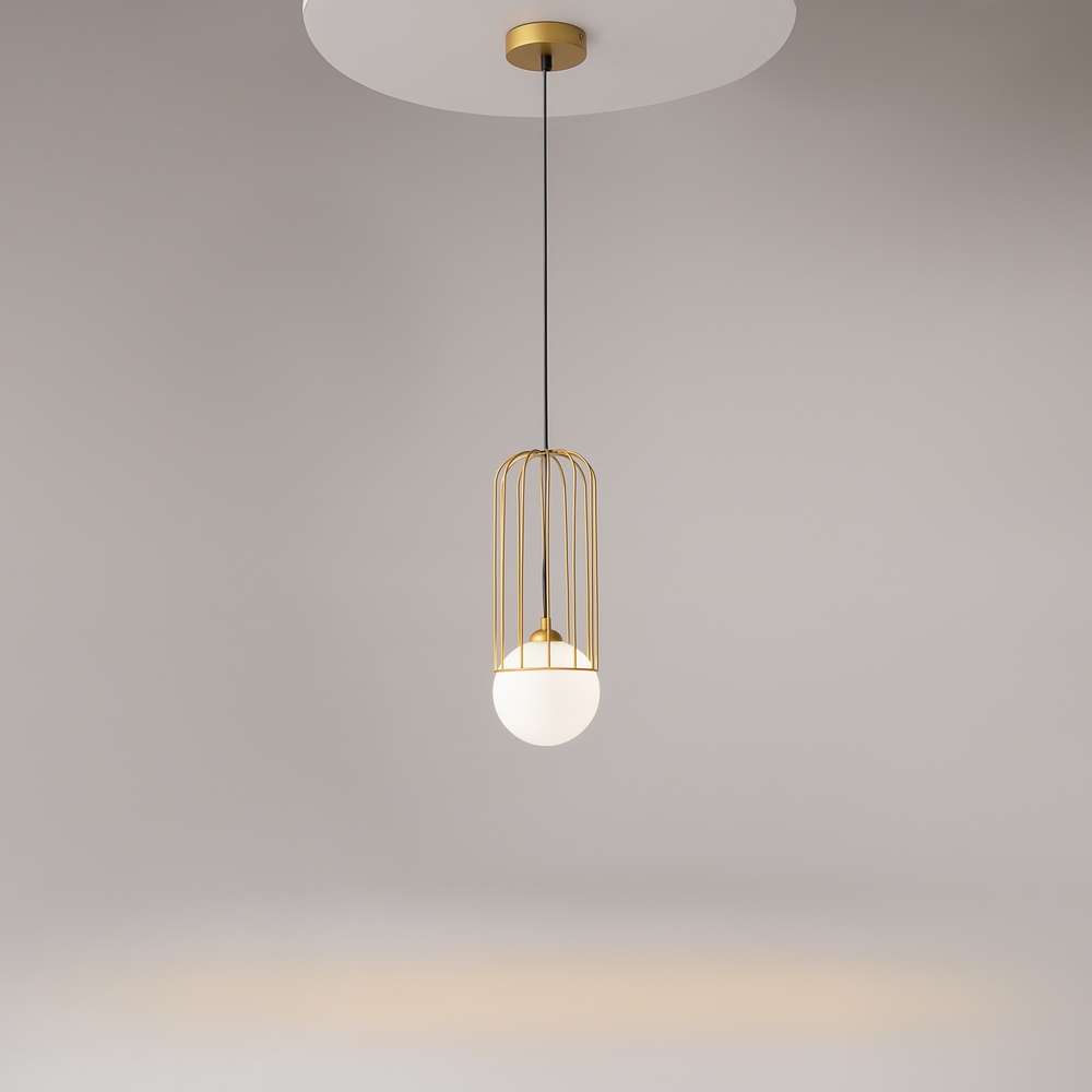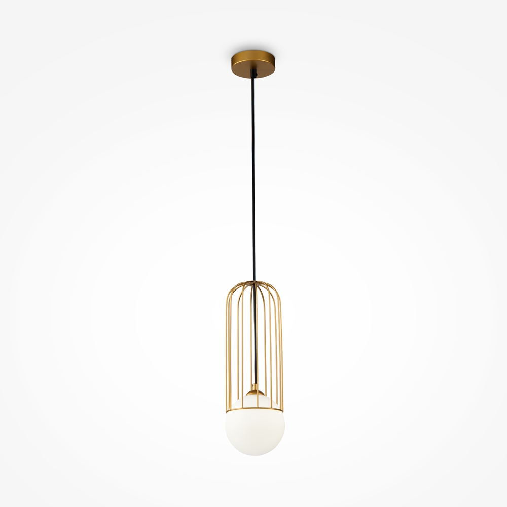 Armatura in metallo color oro. Plafoniera in vetro bianco opaco. Soffitto decorativo Telford - griglia in filo d'acciaio da abbinare ai Armatura. Altezza regolabile.