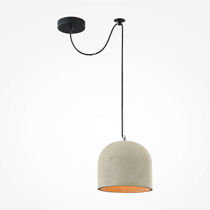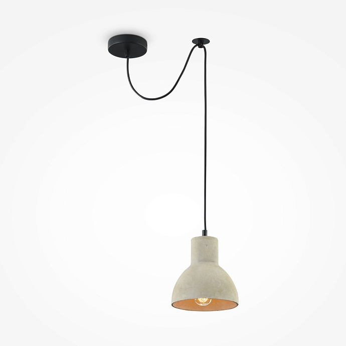 Armatura in metallo nero. Plafoniera in cemento grigio. Supporto aggiuntivo a soffitto. L'altezza è regolabile con un cordino.