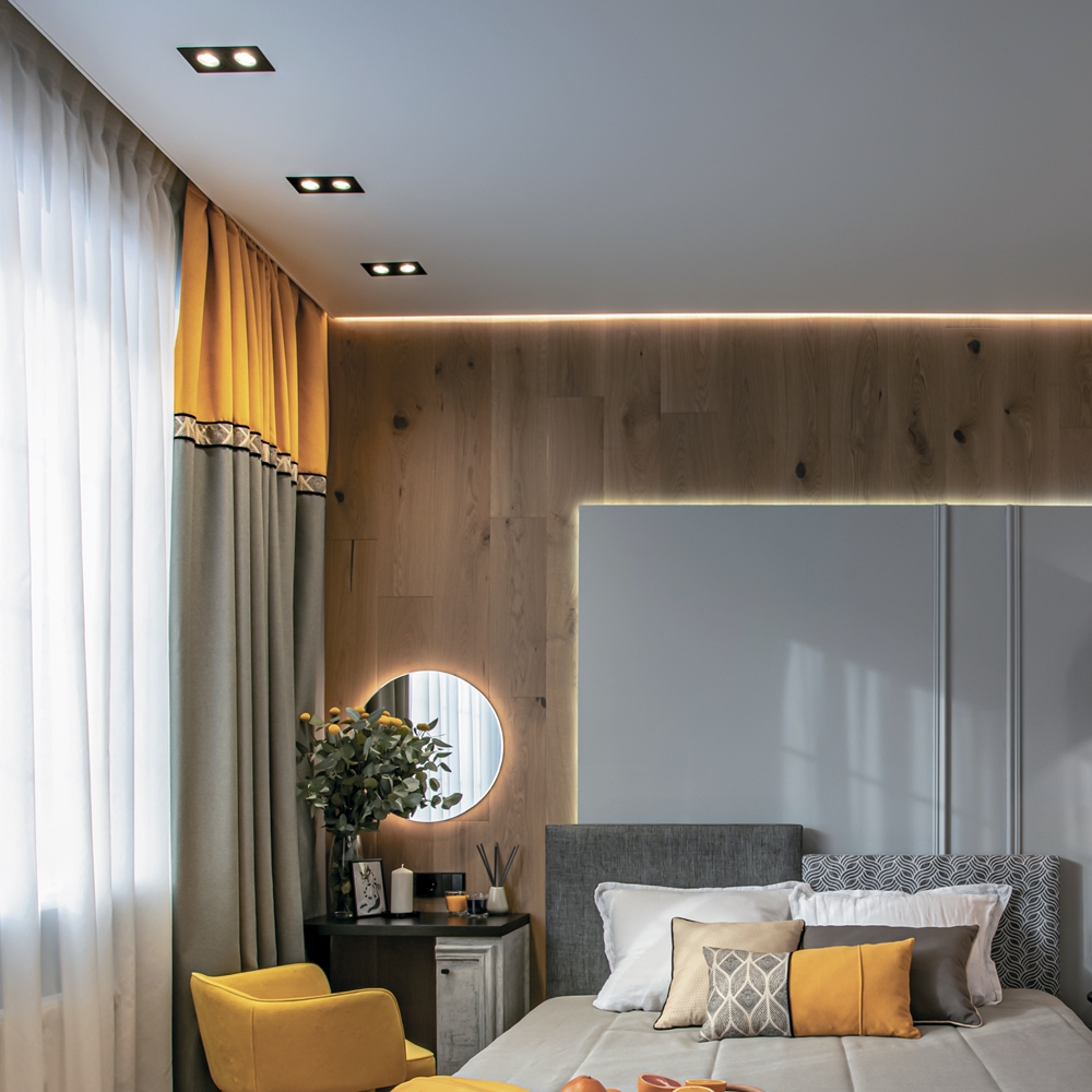 Faretto da incasso, orientabile a 25°. Corpo in metallo verniciato a polvere.