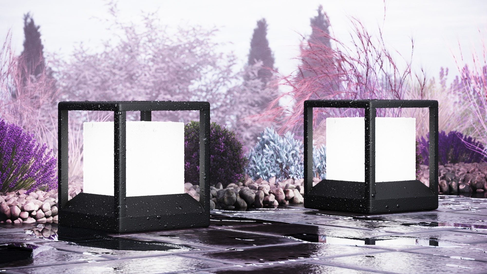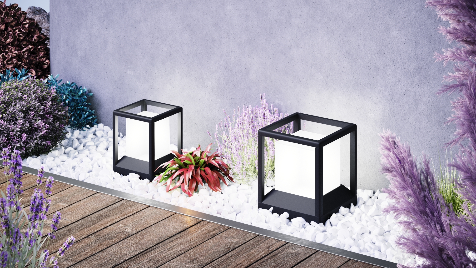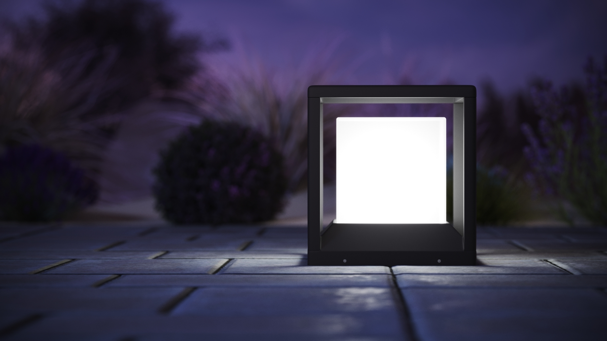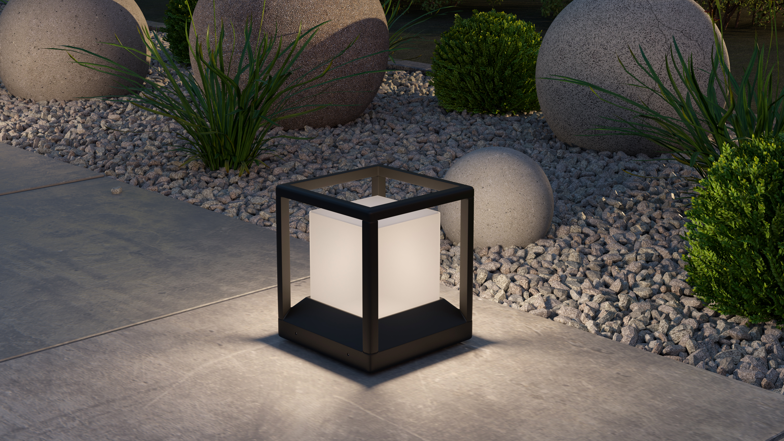Un cubo luminoso in una robusta cornice in alluminio verniciato a grafite è una soluzione elegante per l’illuminazione del paesaggio, delle recinzioni e delle varie colonne.