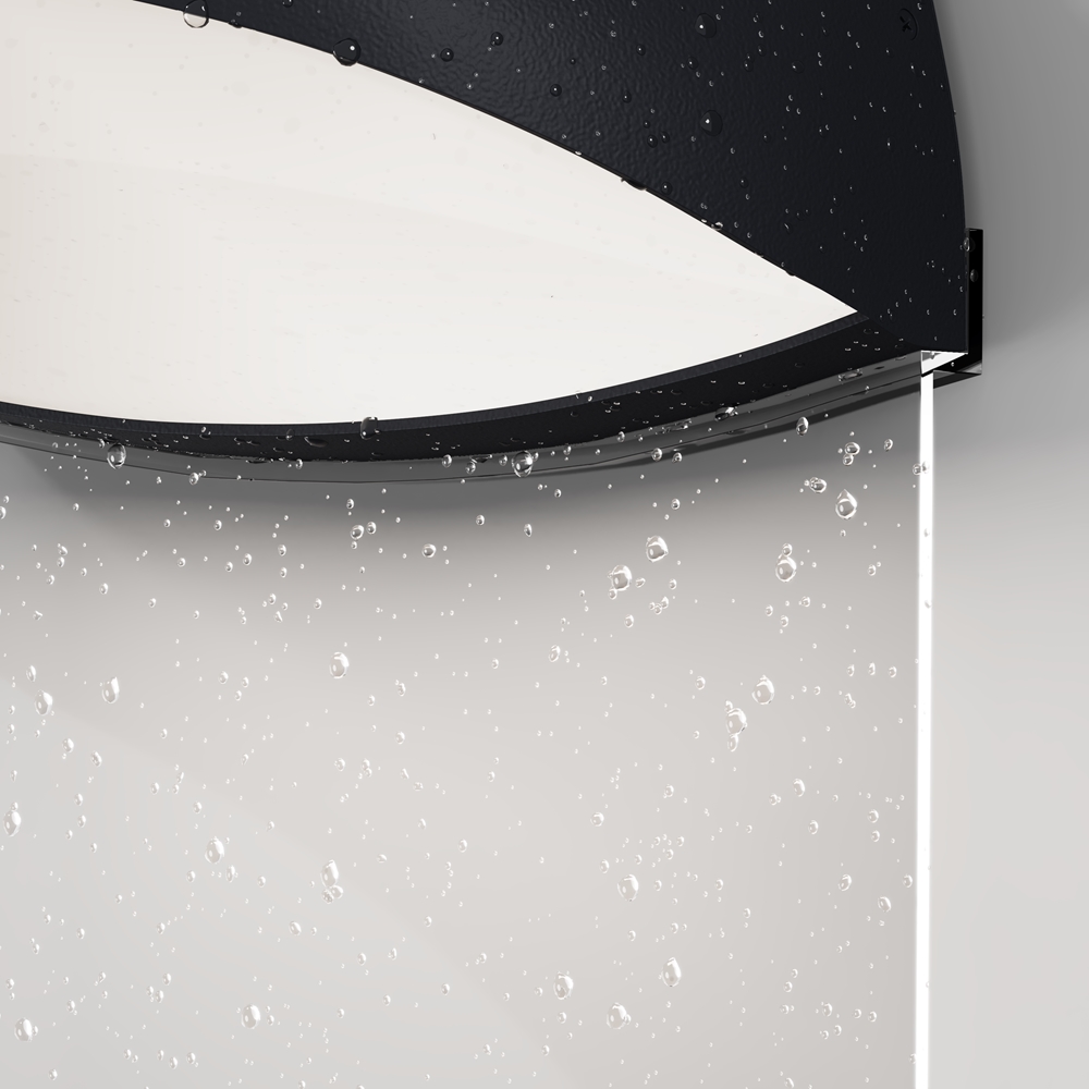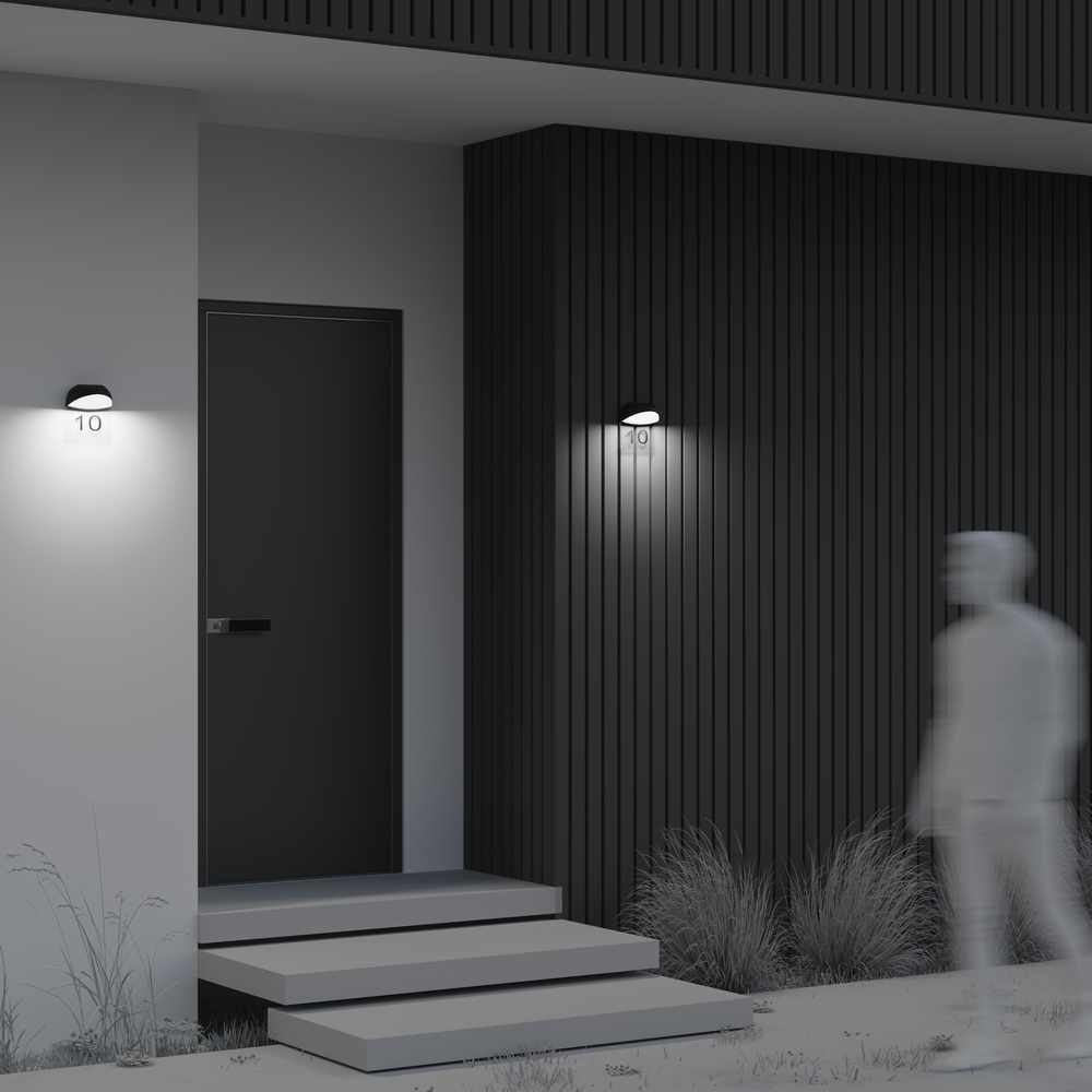 Corpo in alluminio, il colore è grafite. Diffusore in acrilico bianco opaco. Incluso-una targa in plastica trasparente per l'applicazione di designazioni (numeri civici, ecc.). Sorgente luminosa a LED. La temperatura di colore e’ 3000K. Il grado di protezione e’ IP54.