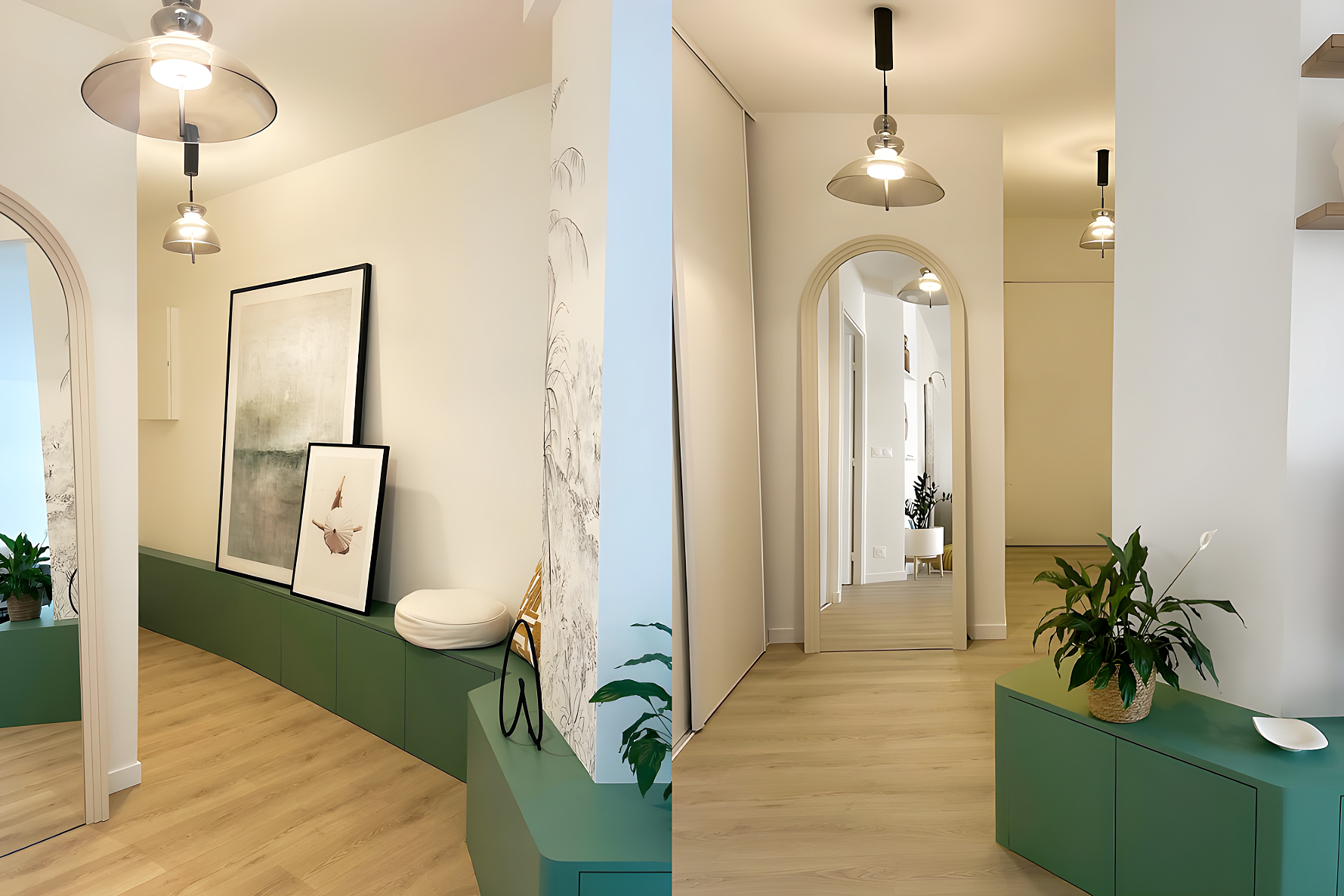 Das transparente Glas sorgt für offene Räume und lässt das Licht frei fließen, während die geometrische Form die maßgefertigte grüne Bank aufgreift und für Stil und Harmonie sorgt. Ein raffiniertes Detail, das den Look vervollständigt und den Flur sowohl funktional als auch stilvoll macht.