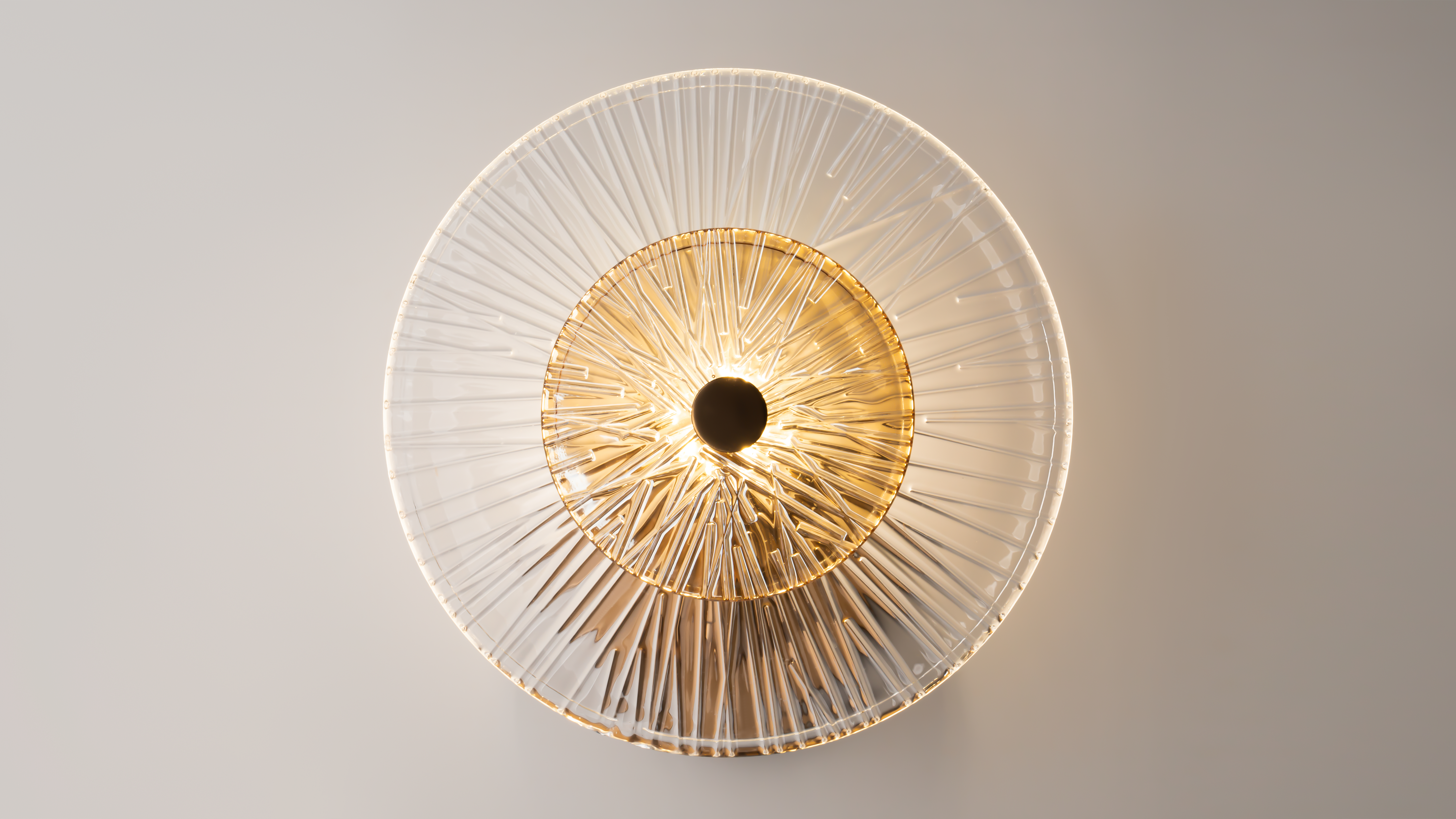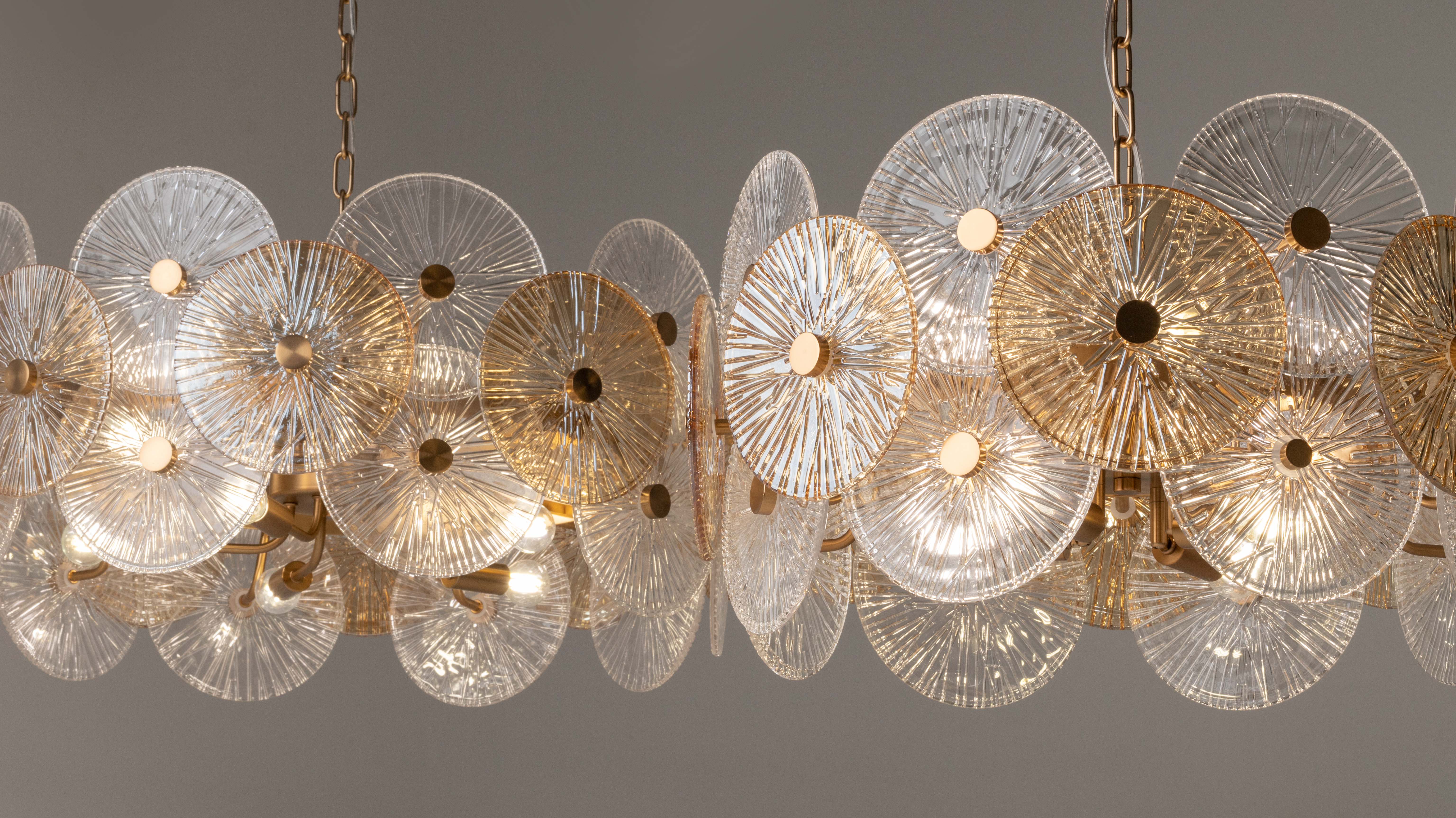 Metalowa oprawa w kolorze złotym. Kulista ozdoba z tłoczonego szkła reliefowego. Połączenie bursztynowego i przezroczystego odcienia w wystroju. Regulowana wysokość. Źródłem światła są żarówki z podstawą E14.