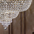 Oprawa wykonana z metalu, kolor – antyczne złoto. Wystrój elementów metalowych – inkrustowany ornament kwiatowy. Wielopoziomowe kryształowe wisiorki osłaniają żarówki.