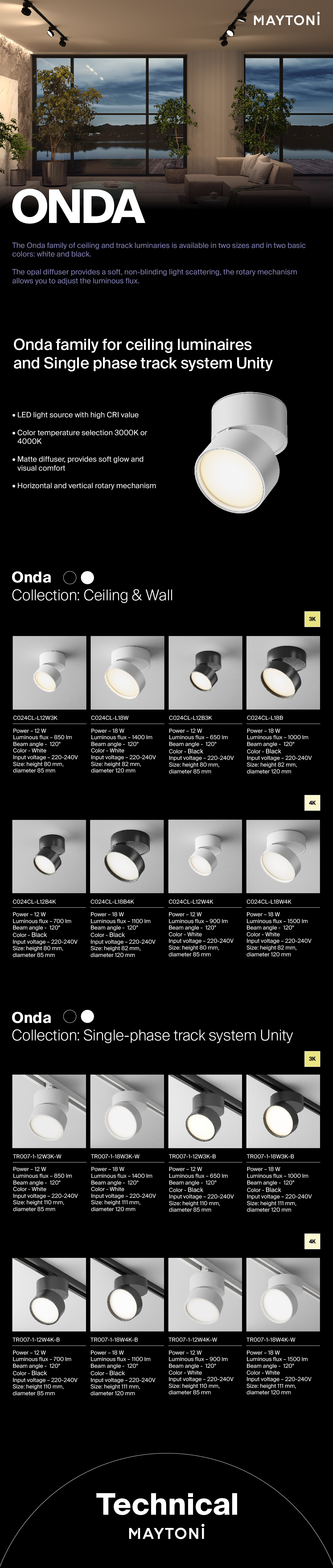 Podseria Onda C024CL zapewnia miękkie, równomierne oświetlenie sufitowe o czystym, stonowanym profilu. Te kompaktowe oprawy natynkowe mają smukłą, okrągłą obudowę z aluminium w kolorze czarnym lub białym i są dostępne w dwóch średnicach – 85 mm (12W) i 120 mm (18W). Dzięki szerokiemu kątowi świecenia 120° emitują delikatne, rozproszone światło, idealne do oświetlenia ogólnego w korytarzach, kuchniach czy miejscach pracy. Temperatura barwowa 3000K lub 4000K zapewnia ciepło albo klarowność, a współczynnik CRI 80 gwarantuje wierne oddanie kolorów. Dzięki nawet 36 diodom LED w każdej oprawie, Onda dostarcza gładkie, zbalansowane światło w formie, która harmonijnie komponuje się z nowoczesnymi wnętrzami.